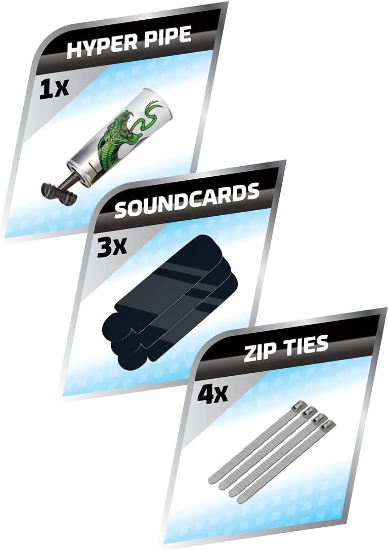 - Includes the 9 inch Hyper Pipe exhaust. 3 sound cards. each with a unique sound and 4 zip ties for easy mounting